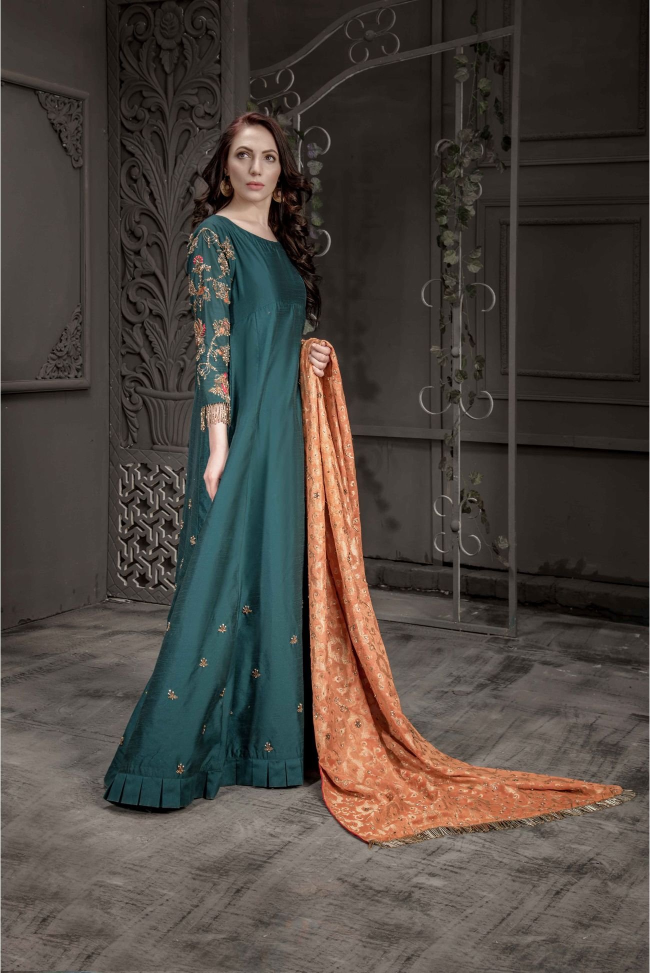 Ethereal and breathtaking! This Exclusive “Bridal Wear” ensemble is a class apart in its elusive allure and heavenly appearance. Utilizing the charming shade of teal and shimmering with intricate embellishments, the floor length matte raw silk dress makes a grand statement. The classic cut of the shirt comes in a set with Indian raw silk straight cut trousers. The striking burnt orange banarsi duppatta with organza trims perfects this three piece ensemble bringing you a design that excites the heart and the soul.