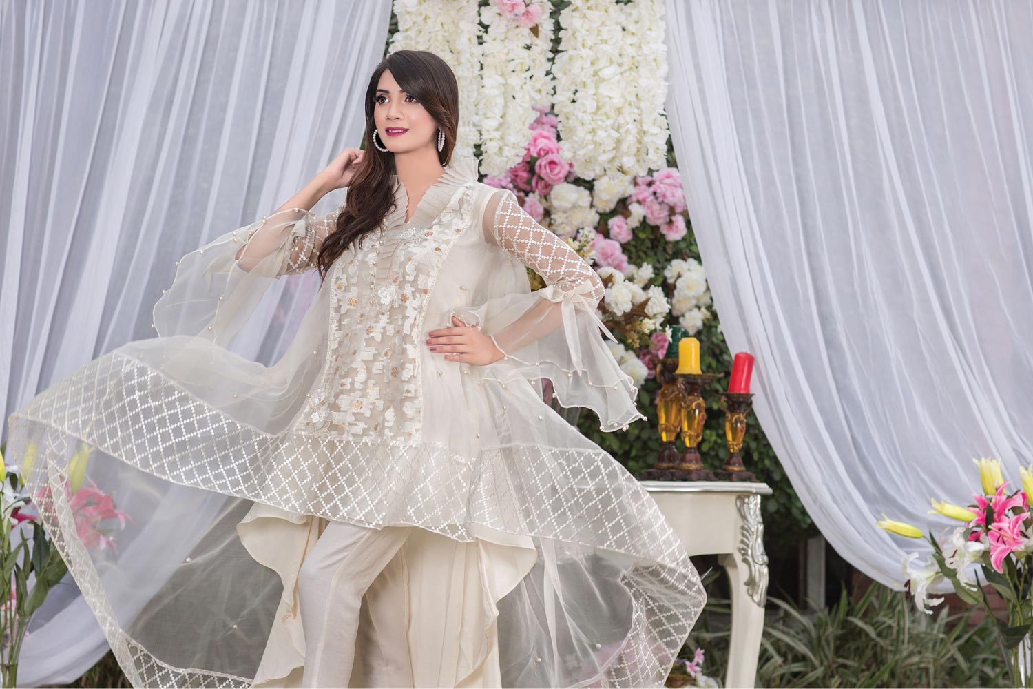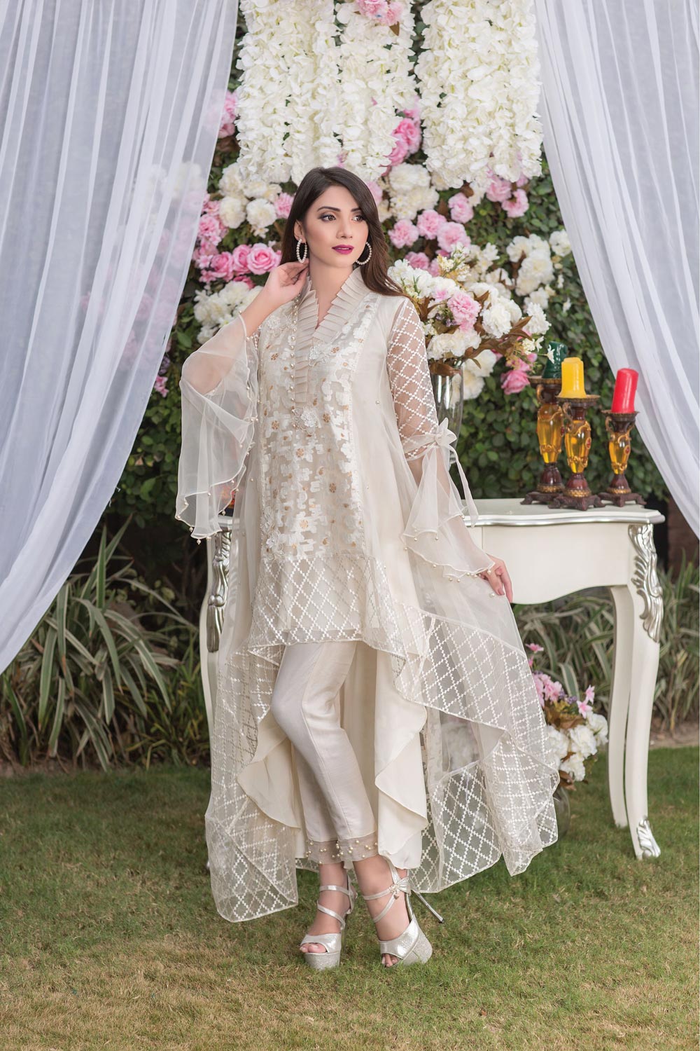 Exclusive never fails to amaze fashion-forward people with latest trend obsessions.Stylize your royal looks with this beautifully designed offwhite luxury pret outfit with ethnic embroideries and contemporary cuts. The dress is embellished with a gorgeous stitching pattern with beautiful hand touching all over the shirt. The upper is fabricated in plain organza and pure self-organza. Paired with stunning crap georgette inner, Indian raw silk bottom and organza trim. Order now and flaunt the stunning luxury pret outfit this festive season